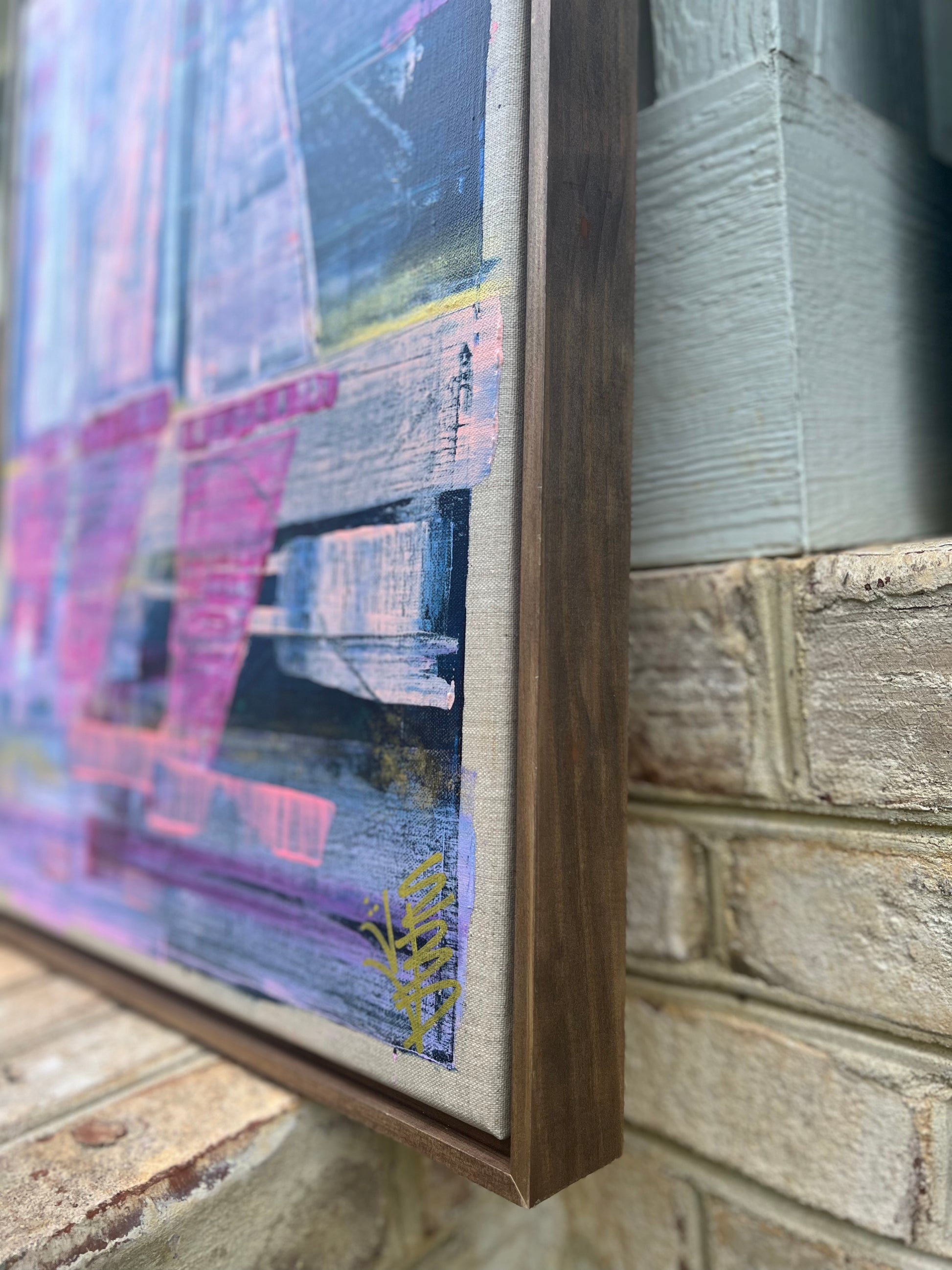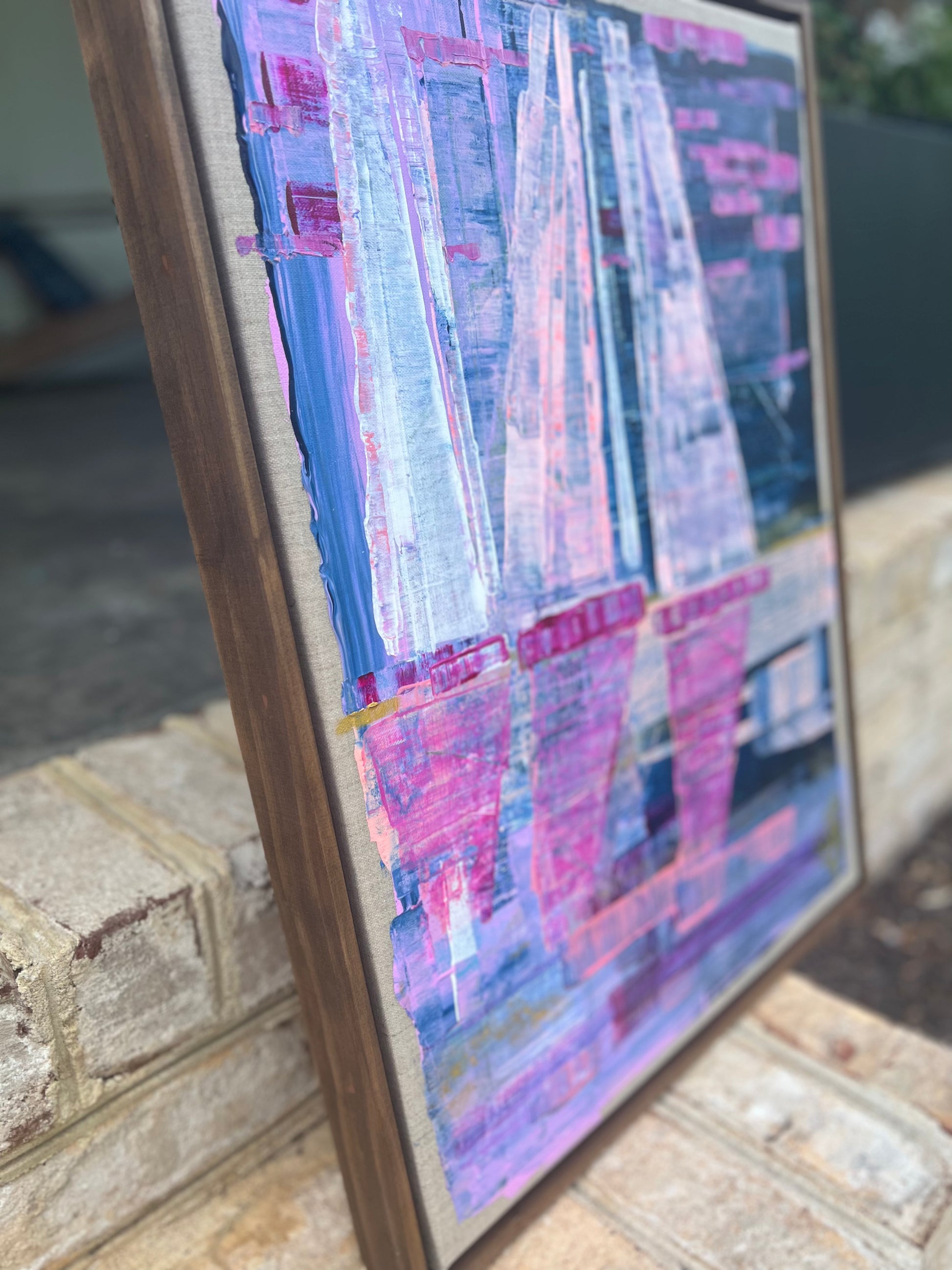 18x24 linen canvas framed in walnut stained modern wood slat style, wired to hang vertically. Abstract, textured and layered, these magenta representations of a small sailing fleet pop off of their Prussian blue backdrop. Gold oil highlighting.