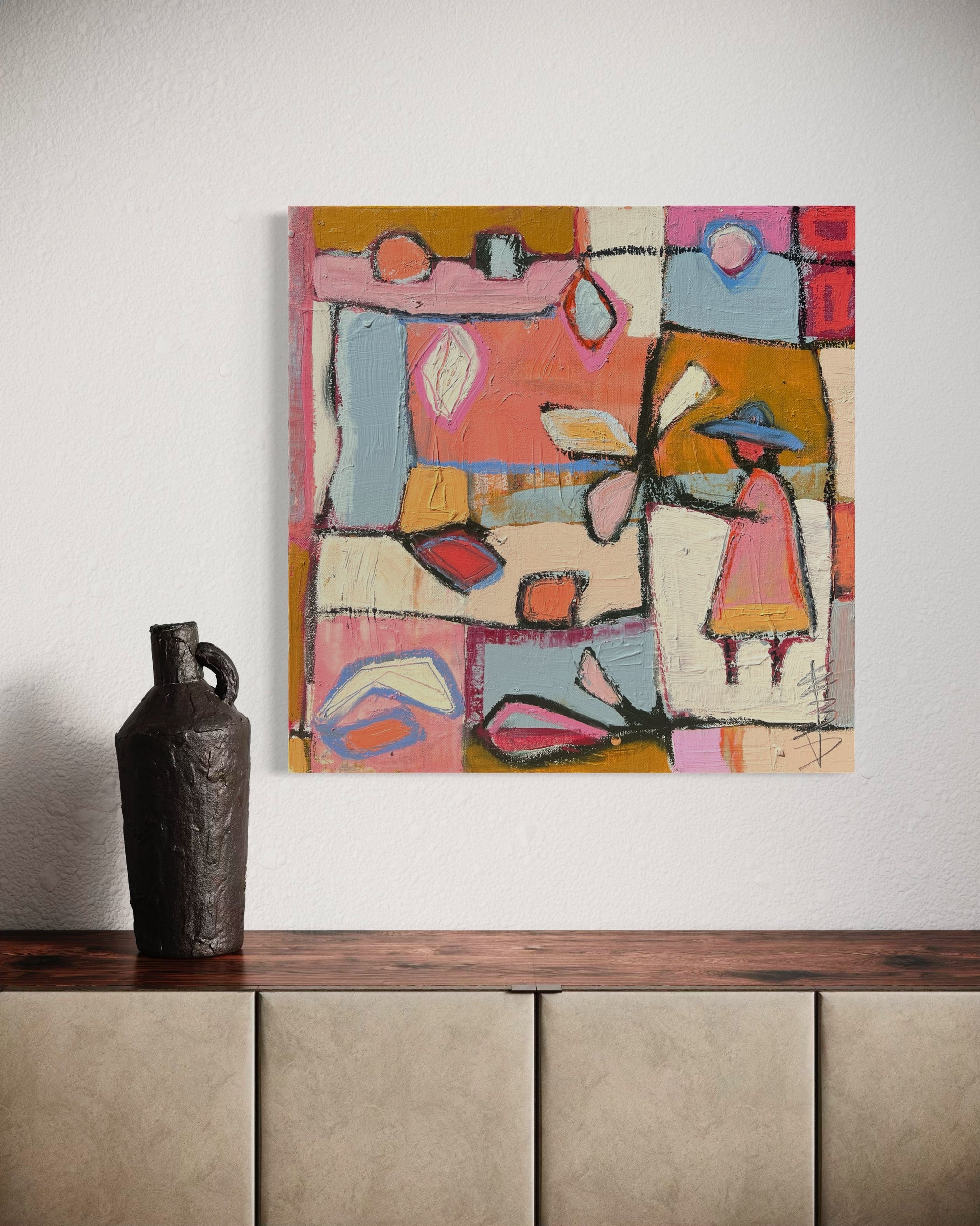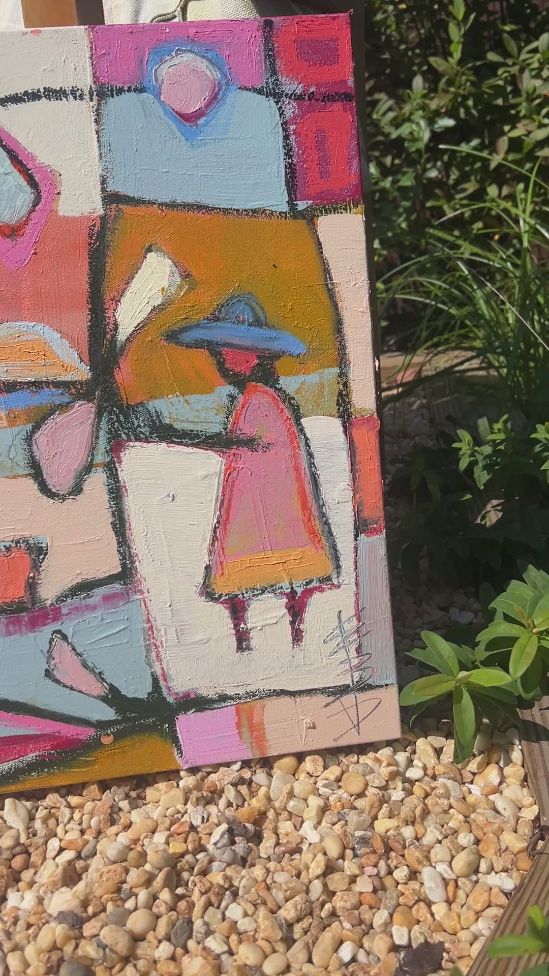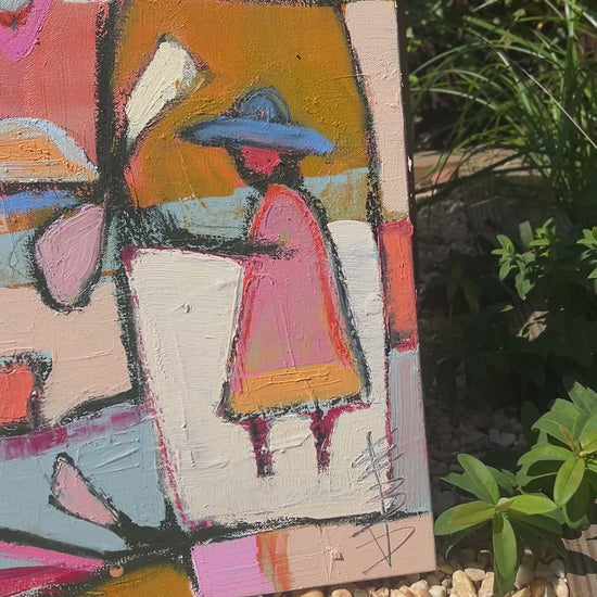 20x20” oil, acrylic, charcoal, cold wax, spray paint on gallery wrapped canvas. These garden gals are built with layers of story telling about interconnection between us and everything else under the sun.