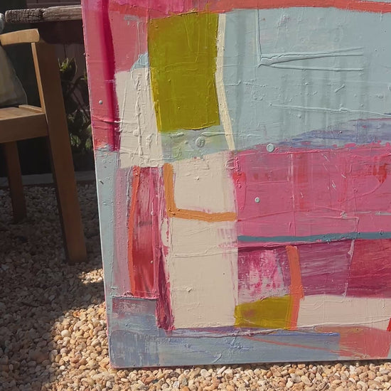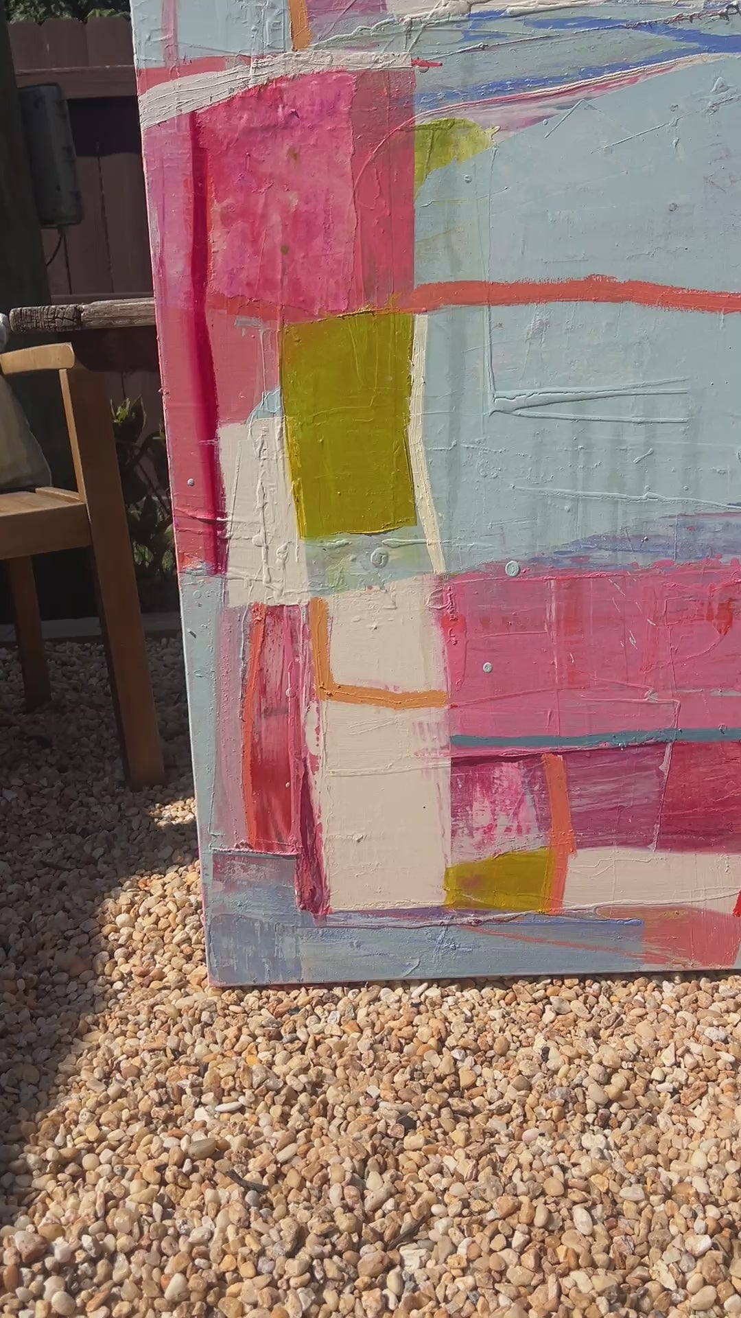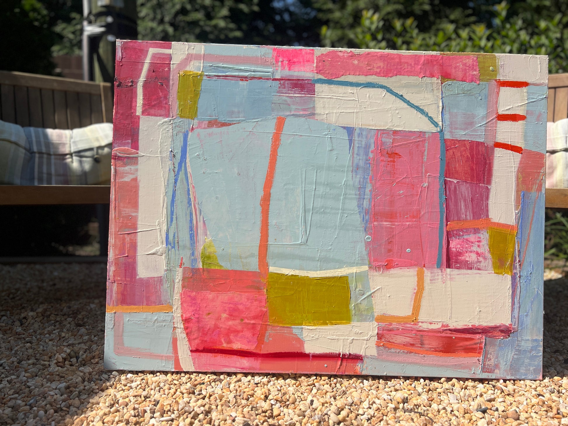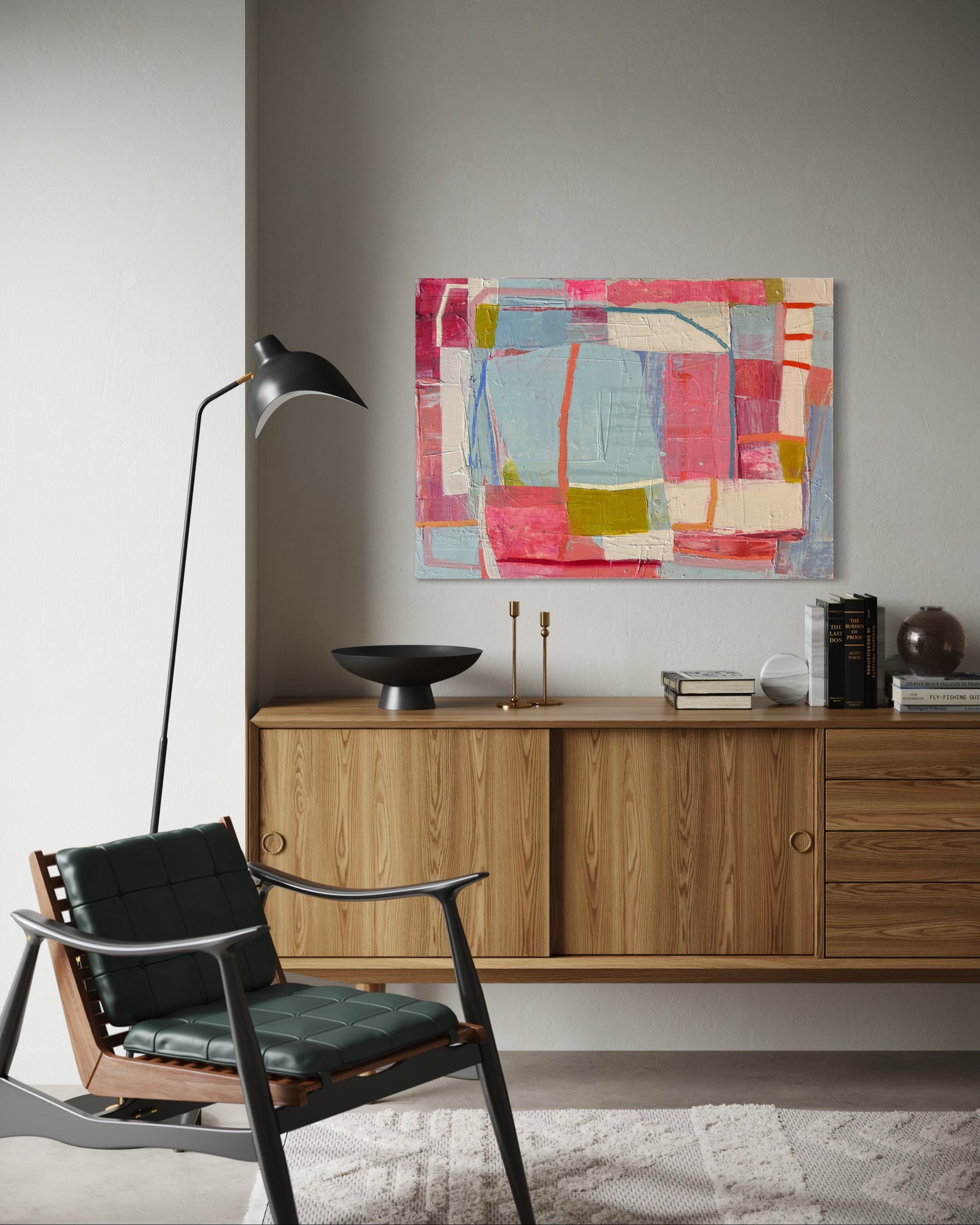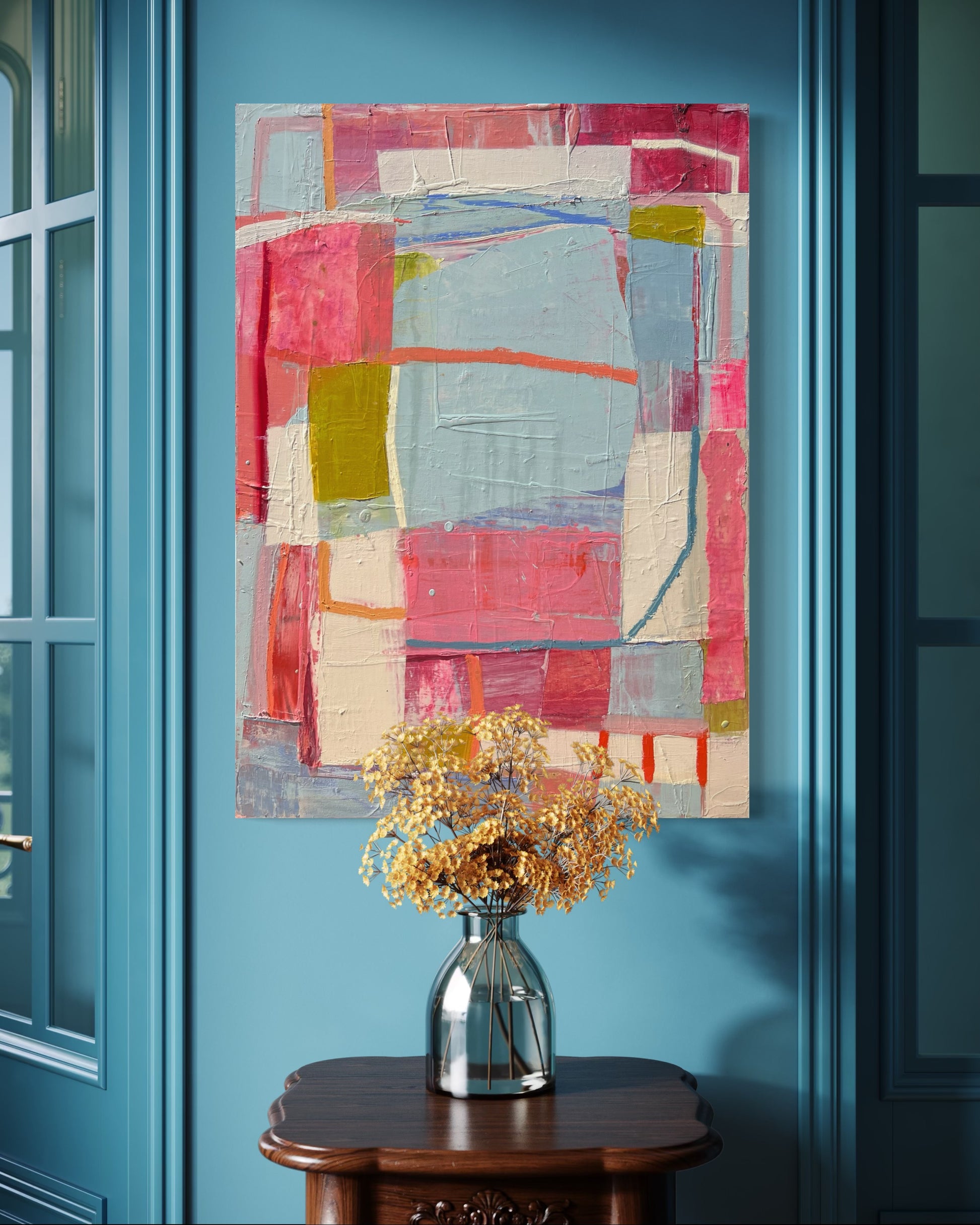30x40” oil, acrylic, charcoal, collaged thai paper on gallery wrapped canvas. This abstract composition was built with intuitive layers, woven together over a series of 6 weeks alongside the building of this collection. Can be hung vertically or horizontally.