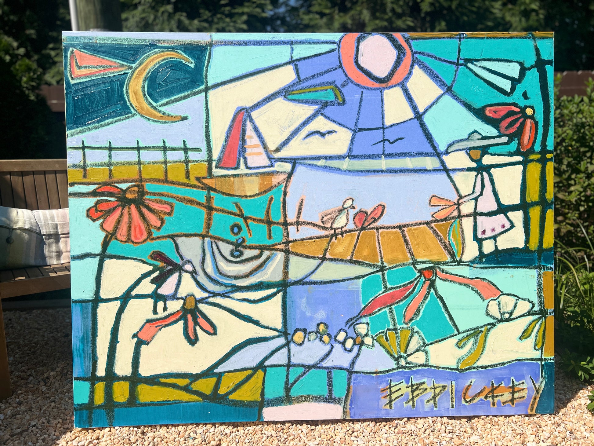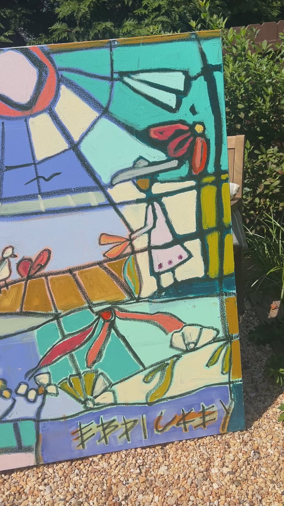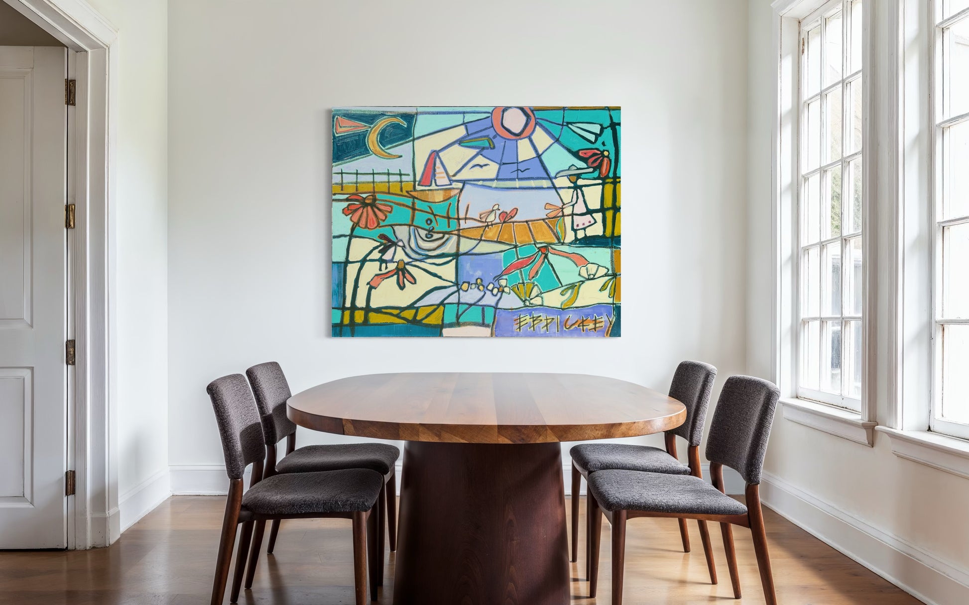 48x60” oil, acrylic, charcoal on gallery wrapped canvas. This narrative piece was created first with a layer of poured acrylic and then covered with rich, textured oil. It tells the story of interconnection between us and the elements that bind us together.